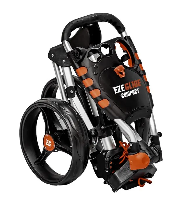 Introducing The Ezeglide Compact Trolley the ultimate 3 wheel golf push trolley weighing only 6 kg & folding down to a very compact 49.5 x35 x56cm. Feature packed with an adjustable handle height, multifunctional console with weatherproof storage space, drinks holder & a tee and ball holder.